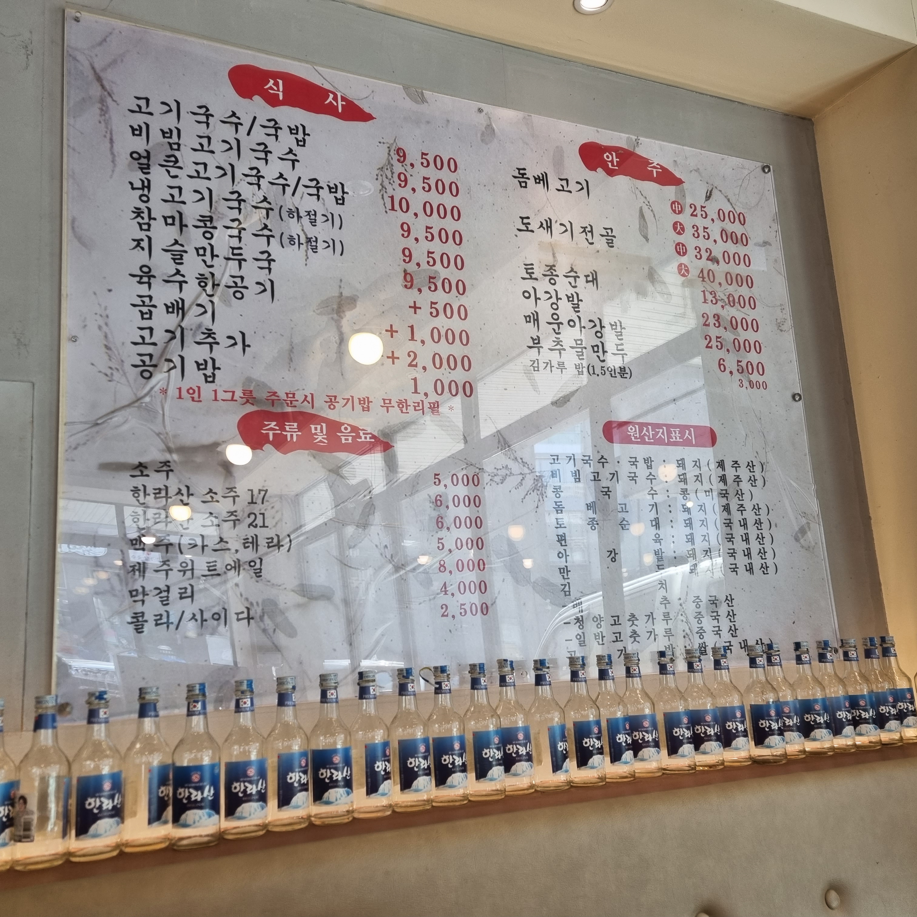 저는 얼큰 고기국수를 주문하였습니다. 아이와 드신다면 그냥 고기국수를 시키시는 것을 추천드립니다. 이곳에 얼큰 고기국밥도 있지만 제가 국밥을 시키지 않고 국수를 시킨 이유가 있습니다. 이유는 바로바로 1인 1주문시 공기밥 무제한 서비스 이기 때문이에요 가격은 10,000원 입니다. 평소 순대국밥을 즐겨먹는데 갑자기 떠오른게 제주 고기 국수더라구요 뽀얀 국물이 정말 진하고 맛도 좋았어요 또 국수와 함께 밥을 말아 먹으니 밥위에 올라오는 국수 몇가닥이 아주 잘 어울렸습니다. 소주는 안시켜 먹을 수 없었어요^^;